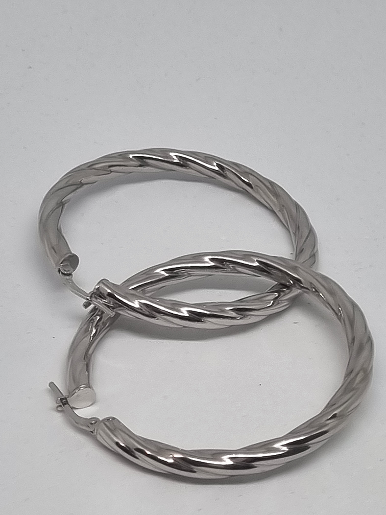 Large snap hoops in the shape of a "braid" or twisted cable, entirely silver.