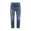 Cotton Jeans by Brunello Cucinelli, vintage worn-effect design, five-pocket straight style, front button fastening, belt loops for waistband, iconic branded signature leather patch printed pressure at back, turned-up hem.