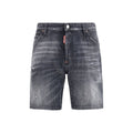 The Washed Marine Shorts by Dsquared2 are crafted from stretch cotton denim with a faded black wash. They feature the classic five-pocket construction, distressed detailing, and a used effect with whiskering. The look is finished with the Dsquared2 patch.