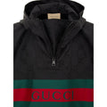 In black technical fabric, allover logo, maxi contrasting Gucci Web Logo on the front, adjustable hood and half zip on the front. Buttons on the sides to adjust the fit, adjustable elastic on the back with internal drawstring.